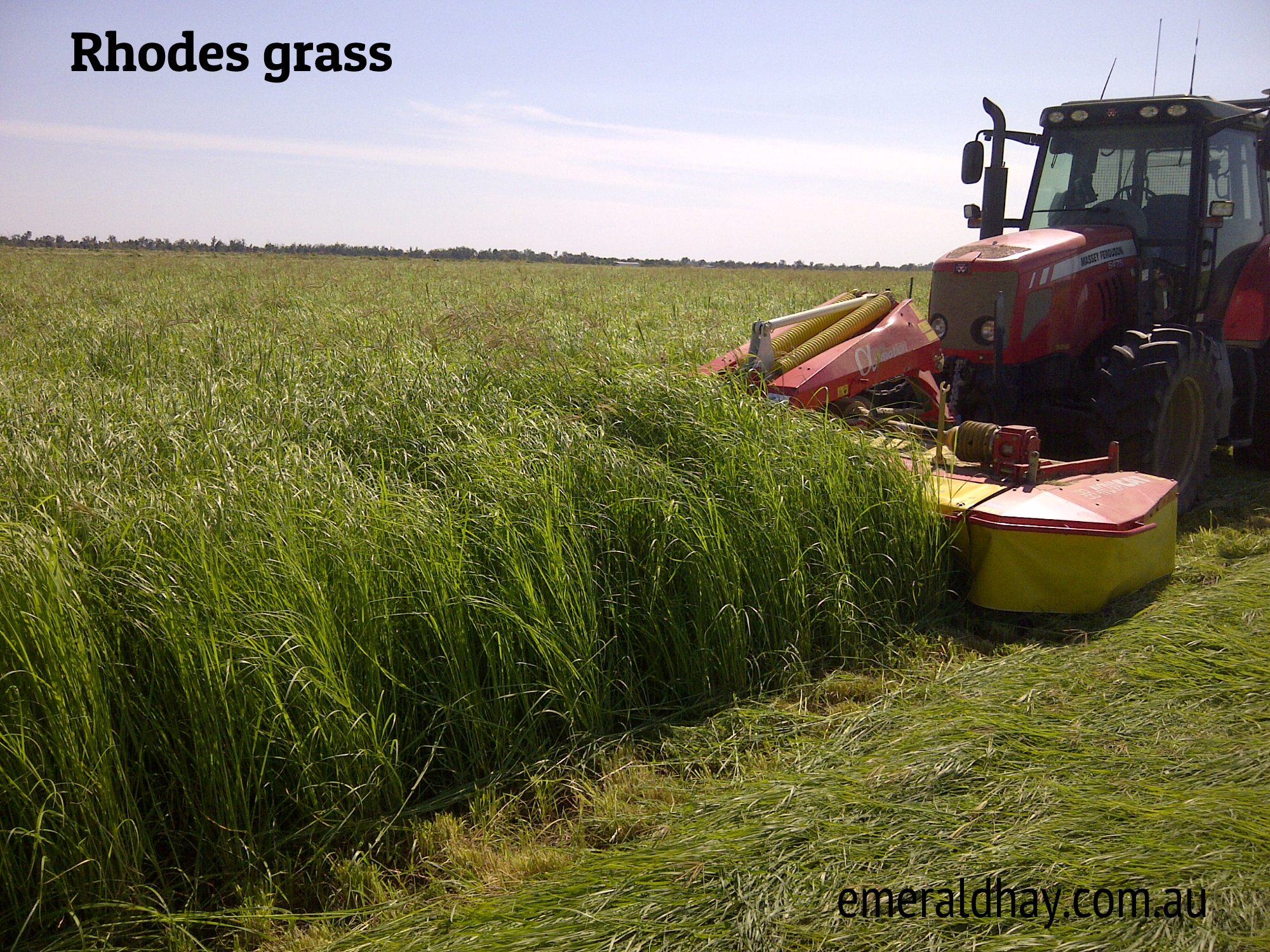 We grow Katambora & Reclaimer variety of rhodes grass which has thinner stems & is suited to hay production. Rhodes grass hay is handled in much the same way as lucerne. We try to cut the grass when it is just coming out in head, this gives plenty of leaf & smaller stems, making a high quality product suitable to feed horses, weaners, bulls & in feedlots. Available in small, large squares & round bales. We have switched from growing forage sorghum to rhodes grass as feedback from customers has told us there is a lot less wastage occurring and it is more suitable for horses.