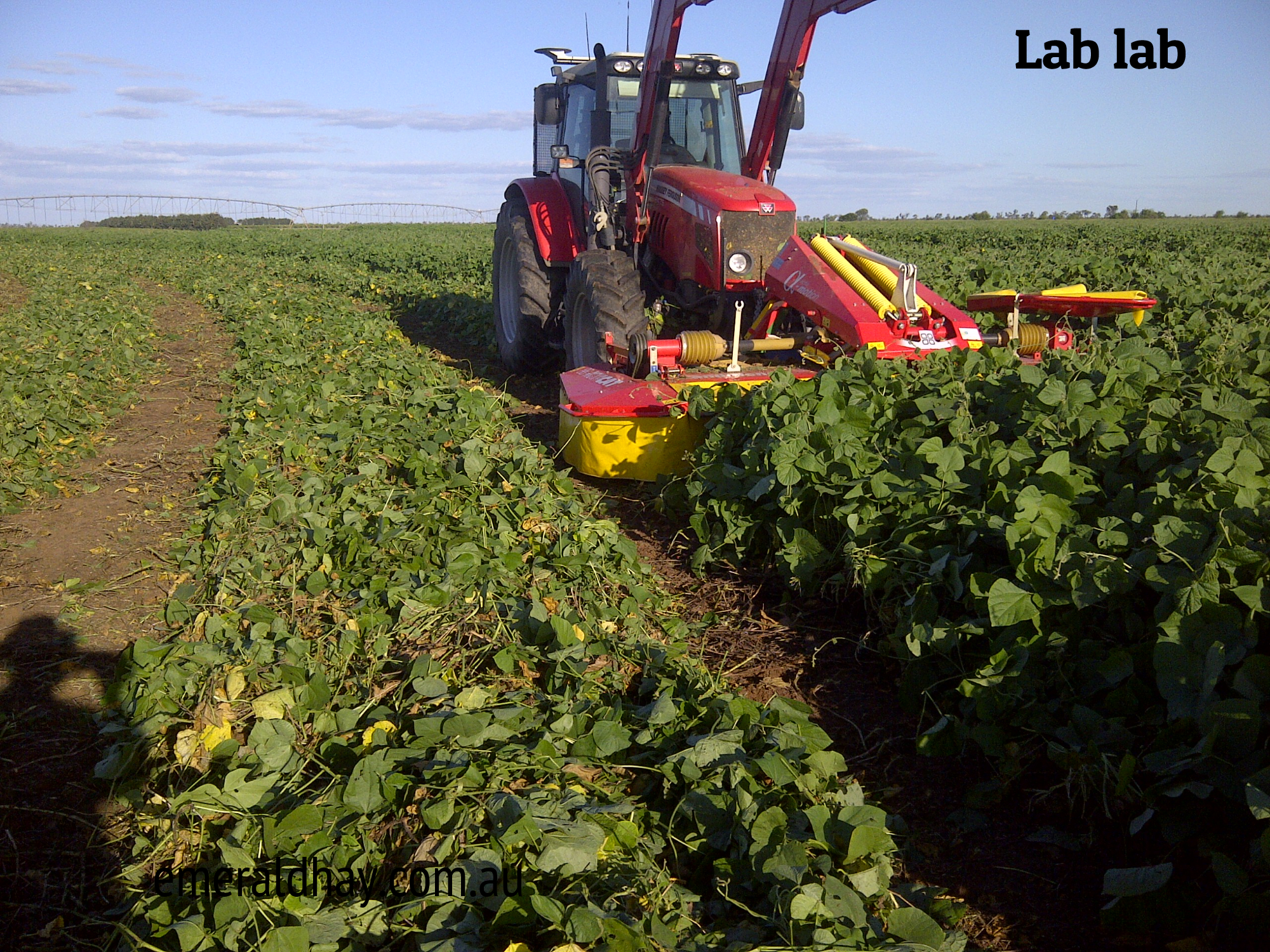 Lablab is a broad-leafed tropical legume & is handled in a slightly different way. As it has very ropey & strong stems when cut, it requires longer curing time (often over a week or two). We bale lablab hay at two different times in the year. The first cut is usually around March which is very good quality - plenty of leaf & smaller stems. If done, the second cut is around July after harvesting the seed. This cut has bigger stalks & lower leaf retention, but is still very palatable to adult cattle. Lablab hay is mainly round baled & large squared, but small squares can be made to order. Suitable for both horses and cattle. Some horse customers have found that their horses take readily to it & do very well on it.